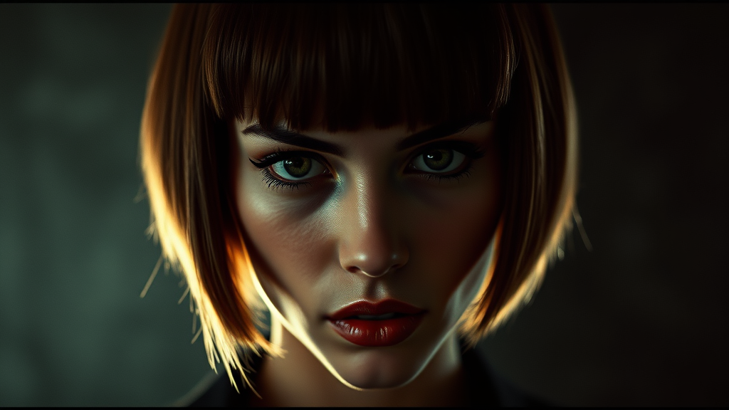 A powerful portrait captures a young woman with a chic bob haircut and intense, captivating eyes. The image is bathed in high contrast, with deep shadows and bright highlights accentuating her defined features. Taken with a vintage film camera and a fast prime lens, the photograph exudes an edgy and unrefined aesthetic. Perfect for fashion editorials, bold advertising, or a captivating wall art piece.
