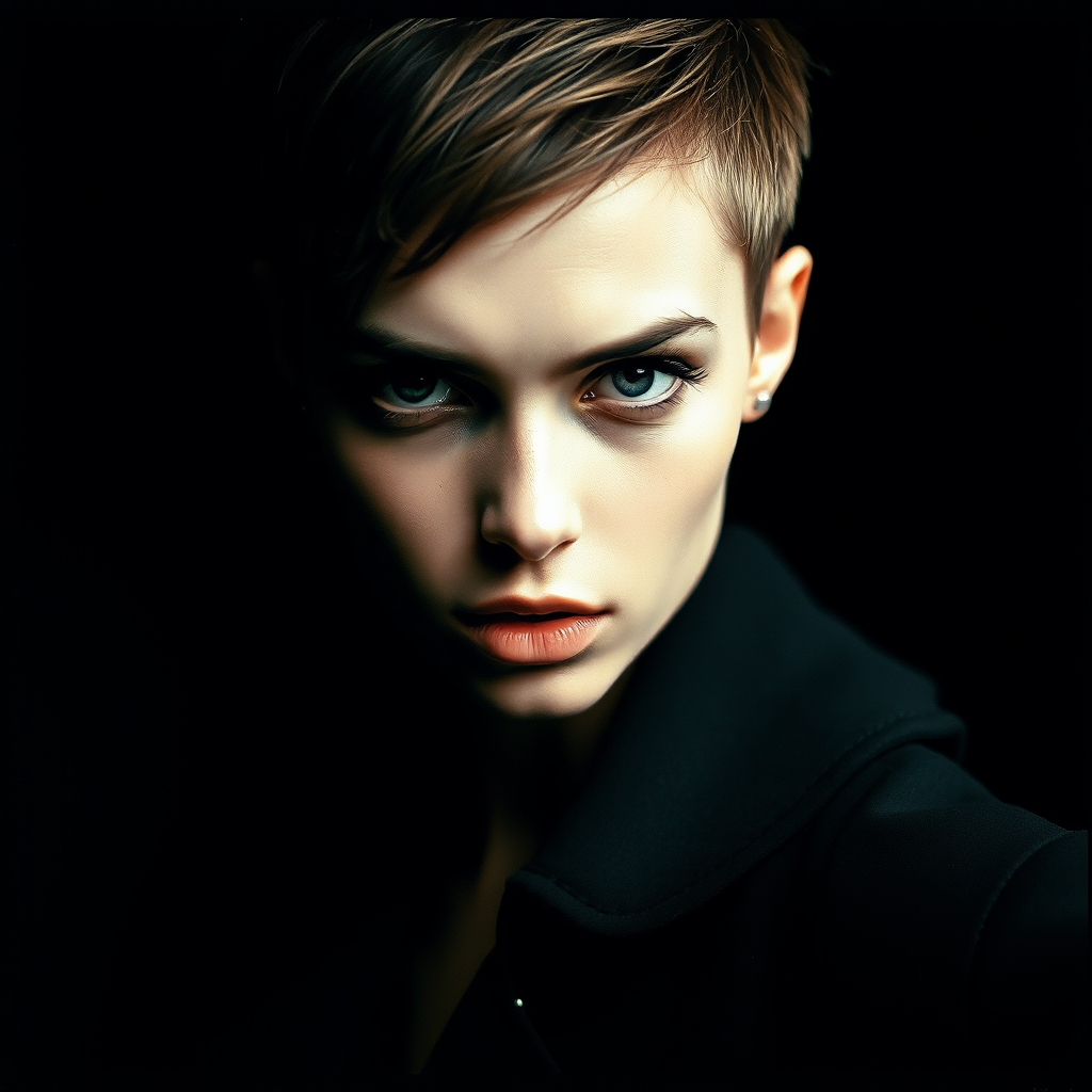 A powerful portrait capturing a young woman with an edgy haircut and intense eyes. The image is shot in a high-contrast style, highlighting deep shadows and bright highlights that accentuate her defined features. Photographed using a vintage film camera and a fast lens, the portrait exudes a gritty, unrefined texture. It's an ideal choice for fashion editorials, marketing visuals, or as a captivating art piece.