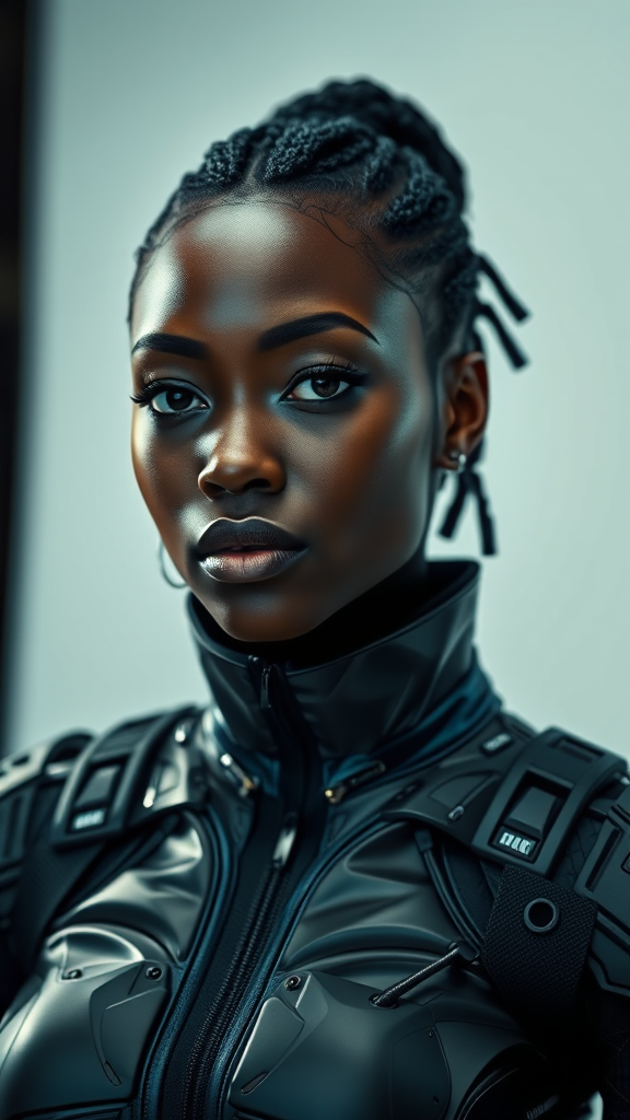 A powerful portrait of a black woman wearing futuristic techwear, featuring an ultra-realistic and highly detailed aesthetic. The image is captured with impeccable studio lighting, enhancing the intricate design and textures of the techwear outfit. The focus is on the blend of modern technology and fashion, highlighting sleek lines and innovative materials. Her expression is confident and enigmatic, embodying strength and style. The background is minimalist to emphasize the subject and her attire, while subtle creative elements add depth and intrigue to the overall composition.
