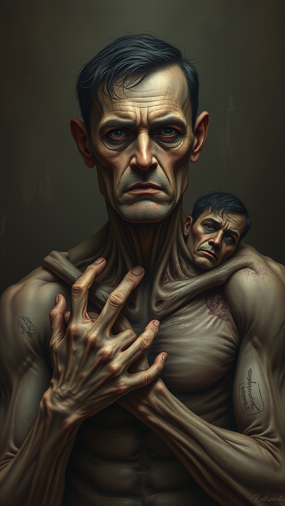A powerful portrait of a solitary and broken man, exuding brutality wrapped in a calm yet heartrending gaze, set against a backdrop of darkness and horror. The composition is unsettlingly intricate, plunging into deep emotional layers and casting a lingering, haunting imprint on the mind. The portrayal features low-quality elements, with visible jpeg artifacts and duplications adding to its unsettling aura. The man's distorted features, from his poorly drawn hands and face to the mutations and deformities, create an eerie sense of physical disruption. His anatomy defies logic, with misshapen limbs and misaligned proportions, depicting extra or missing body parts, such as arms and legs, contributing to a terrifying visual experience. In this morbid illustration, a grotesquely elongated neck adds to the character’s nightmarish appearance, while photographic elements like names, watermarks, and signatures seem almost haphazardly censored, amplifying the composition's unsettling and unforgettable nature.