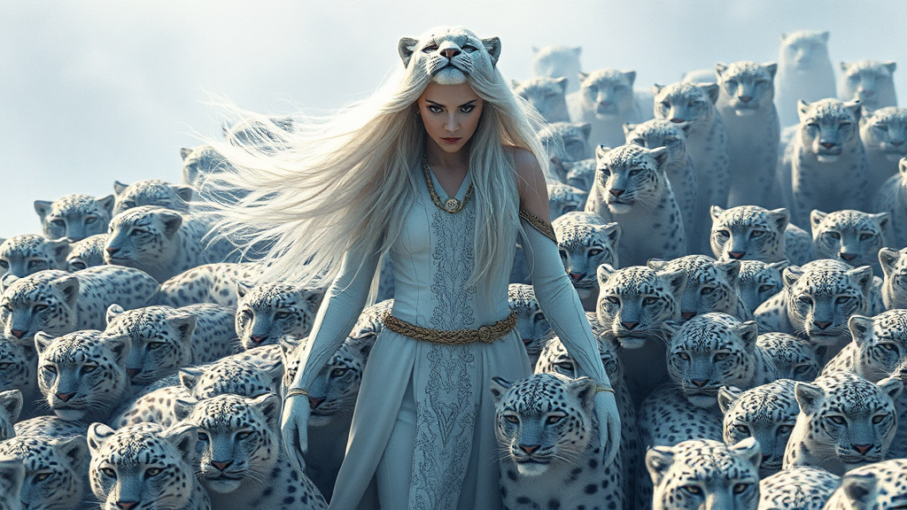 A powerful snow leopard goddess woman stands in a dramatic pose, exuding an aura of command. Her striking white hair flows around her as she emanates a tense, focused expression. She is encircled by a majestic gathering of dozens of snow leopards, each depicted with stunning photorealism and detail. The scene is captured in 8k resolution with a wide-angle view, emphasizing the dynamic energy and intricate composition. The setting is a masterpiece of art, capturing the essence of this majestic being in a tense moment, her eyes full of determination, all set against a stunning snow-covered landscape.