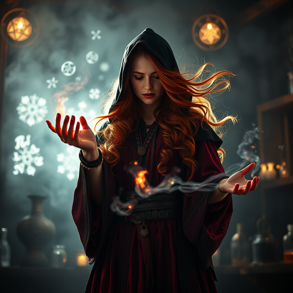 A powerful sorceress with flowing auburn hair, clad in a dark hood and intricately designed robes of crimson and sable, performing a mystical incantation, vibrant magical energy swirling around her, set against a shadowy backdrop of flickering light, mystical symbols gracefully orbiting in the dimly lit air, an enchanting alchemical laboratory serving as the backdrop, extreme precision in detail, illuminated dramatically from behind, captured from a low-angle shot, 16k resolution, UHD, HDR, evoking an otherworldly ambiance with a touch of surrealism.