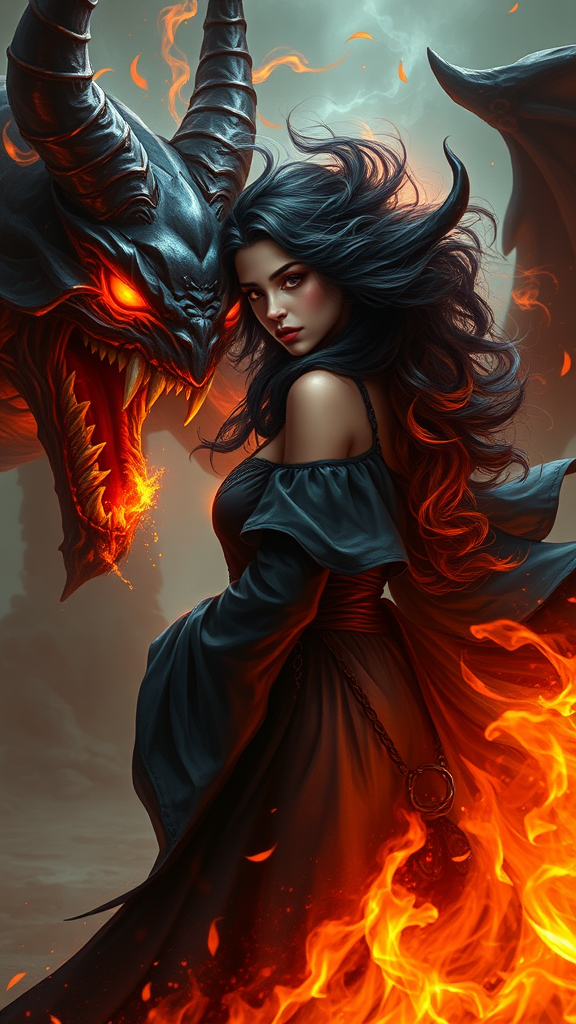 A powerful sorceress with swirling ebony hair stands boldly before a menacing demon, her figure a mesmerizing blend of dark flames that dance with an otherworldly intensity. Capturing the essence of epic fantasy card game art, the side portrait of this enigmatic witch is bathed in dynamic lighting, enhancing her commanding presence. Her eyes, glinting with eldritch wisdom, confront the demon, while the UHD 4k detail showcases the intricate textures of her fiery form and the magical aura that surrounds her.