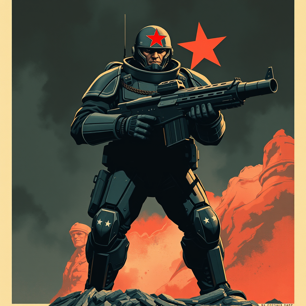 A powerful Soviet soldier of the future stands ready, enveloped in a sleek, sci-fi suit, wielding an impressively large gun reminiscent of Warhammer aesthetics. The design channels the essence of a USSR propaganda poster, infused with anime and manga graphics for a modern twist. Dark, brooding colors dominate the scene, enhanced by the offset printing style that lends an air of vintage authenticity. Every detail is meticulously rendered in high-definition, creating a stunning 8K visual experience. The natural lighting casts dramatic shadows, bringing depth and intensity to this fusion of past and future warrior imagery.