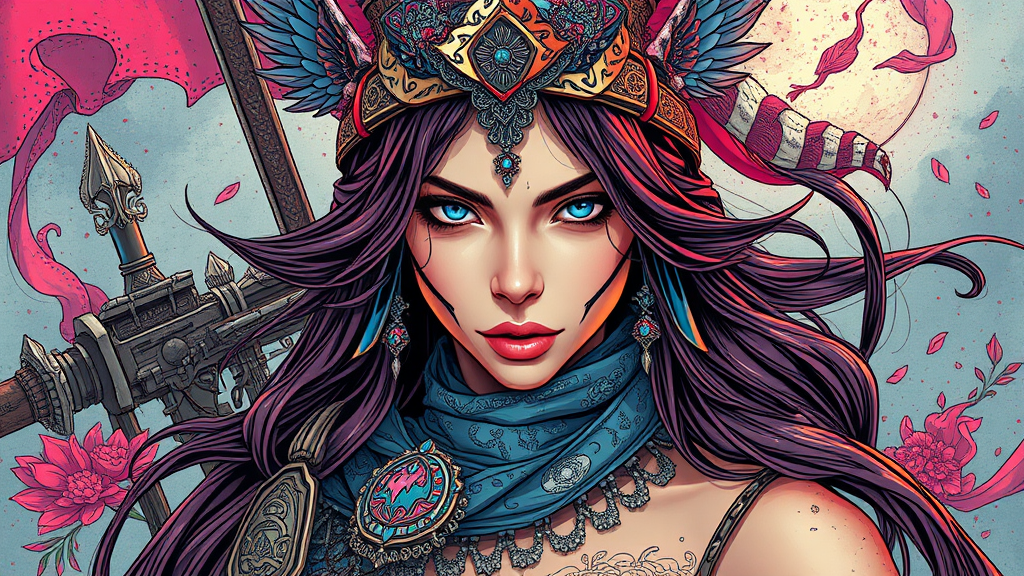 A powerful warrior princess | centered in focus | key visual element | elaborate and highly detailed | awe-inspiring elegance | impeccable lineart | vivid and dynamic | immersive cinematic experience | inspired by the styles of Carne Griffiths and Conrad Roset.