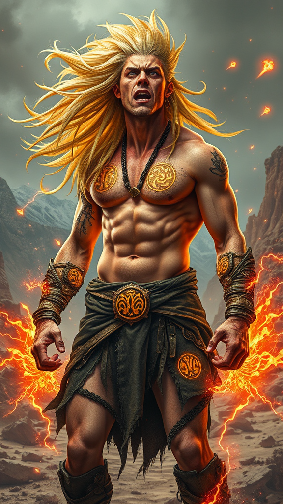A powerful warrior with extra long golden hair stands amidst a war-torn landscape, exuding a fierce, uncontrolled rage. His eyes blaze with intensity as he screams, channeling a massive surge of raw energy that crackles around him. Despite his injuries and the dirt clinging to his skin, he remains unfazed, his tattered clothes revealing a muscular physique. Serious and focused, his body is adorned with intricate glowing golden runes, pulsating with power. An intense orange and yellow aura surrounds him, flickering like fire, casting a fiery glow over the mountainous desert backdrop. Striking a dynamic and epic action pose, this character is depicted in a futuristic glamour style, with symmetrical lines and redshift effects enhancing the visual spectacle. Jagged energy trails and spectacular backdrops bring a comic book flair to the scene, reminiscent of dramatic compositions seen in DC Comics illustrations.
