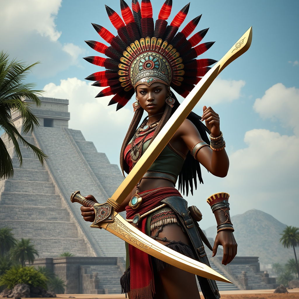 A powerful warrior woman in an indigenous-inspired attire stands majestically before an ancient, towering pyramid. Her fierce expression is accentuated by the intricately designed, vibrant headdress she wears, a blend of traditional Native American and Afrocentric motifs. In her hand, she brandishes a gleaming, ornately decorated sword that reflects her resolute spirit. This scene, evoking the essence of Chinwe Chukwuogo-Roy's artistry, is masterfully rendered in ZBrush, giving it a lifelike 3D appearance. Set against a backdrop of an afrofuturistic landscape, the fusion of past and future is portrayed through the harmonious blending of cultural elements and futuristic aesthetics.
