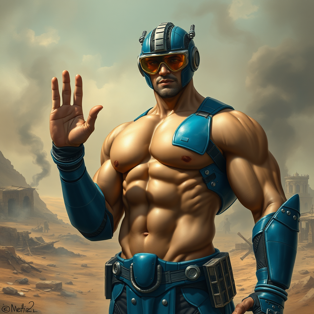 A powerful, well-built man clad in sleek blue body armor and futuristic goggles stands prominently in a barren, smoky desert village. His muscular form is accentuated by the armor, showcasing his chiseled abs and fit physique. He waves one hand confidently, the landscape behind him filled with remnants of a deserted settlement, wafts of smoke curling up into the sky. His futuristic ensemble includes an intricate, robot-like headpiece, adding a touch of the extraordinary to the scene. The image captures a mix of raw power and enigmatic allure, crafted in the artistic styles reminiscent of Boris Vallejo, Frank Frazetta, and Alex Ross, blending classic fantasy with a modern, sci-fi twist in a full figure portrait setting.