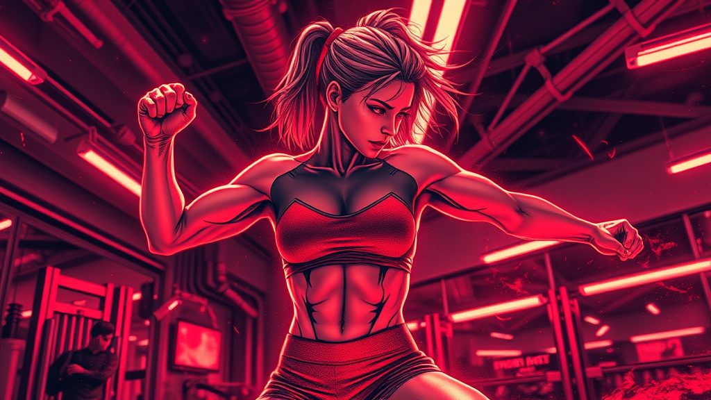 A powerful woman demonstrating intense fitness at the gym, exuding a galactic aura with hints of fire-like intensity. The scene is reminiscent of satellite imagery, with intricate and sweeping views. The stylistic influence of Yoji Shinkawa is evident in the sharp, dynamic lines and details. The setting is infused with neon red color, creating a vibrant and energetic atmosphere. She wears a cotton outfit that enhances her form and function, blending futuristic elements with athletic prowess. The overall aesthetic strikes a balance between otherworldly and determined, with an emphasis on precision and stylized intensity.
