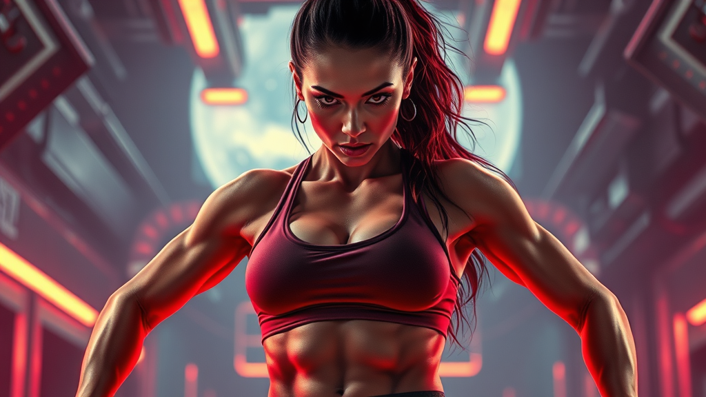 A powerful woman in a futuristic gym, exuding galactic energy with a fiery determination in her eyes, set against a backdrop resembling satellite imagery. The scene is influenced by the artistic style of Yoji Shinkawa, with neon red accents highlighting her form, clad in a cotton workout outfit. The atmosphere combines elements of high-tech and intense focus, with a vivid, stylized quality.