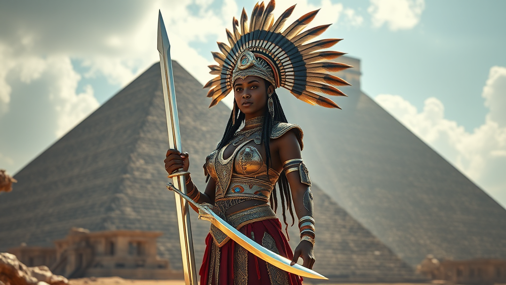 A powerful woman of indigenous heritage stands confidently before an ancient pyramid, clad in intricately designed traditional regalia that incorporates both modern and ancestral elements. She holds a gleaming sword, its blade reflecting the sunlight, while an elaborate headdress adorns her head, merging feathers with futuristic metallic accents. The scene is crafted with the precision and detail of a Chinwe Chukwuogo-Roy painting, reimagined in a 3D render using zbrush. The tableau embodies afrofuturism, seamlessly blending cultural reverence with forward-thinking innovation.