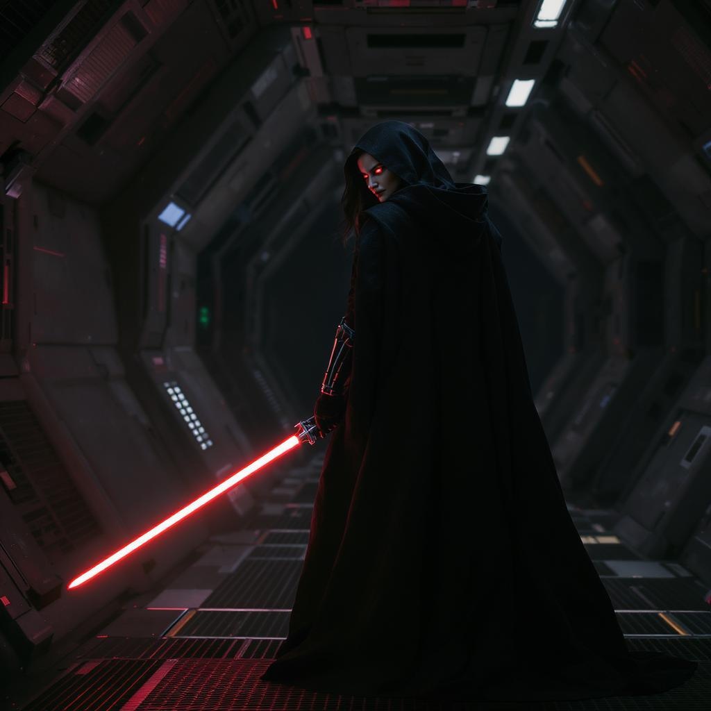 A powerful woman, transformed into a Sith Lord, exudes an aura of menacing authority. Her piercing red eyes glow with intensity, and a crimson lightsaber is held firmly in her right hand, extended outward at a 45-degree angle. Dressed in a flowing black cloak, she stands tall and fierce, anger radiating from her posture. Her back is turned to the viewer, offering a full-body view that captures her formidable presence. The dark hallway of a spaceship surrounds her, adding to the menacing atmosphere with its shadowy, metallic architecture. Subtle reflections of the red blade flicker across the walls, enhancing the ominous ambiance.