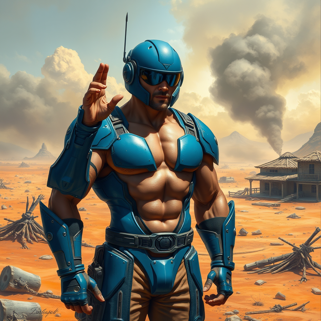 A powerfully built man clad in sleek, blue body armor, with a futuristic, robot-like headpiece and advanced goggles, stands resolute on the scorched earth, his chiseled physique and defined abs glistening under the harsh sun. He raises a hand in a gesture of caution or command, surveying an abandoned desert village shrouded in an ominous haze of rising smoke. The scene captures the vivid style reminiscent of Boris Vallejo, infused with the dramatic and bold elements of Frank Frazetta, while also echoing the hyper-realistic and polished artistry of Alex Ross. In this panoramic tableau, the stark contrast of muscular human strength against a backdrop of desolation suggests tales of heroism and mystery.