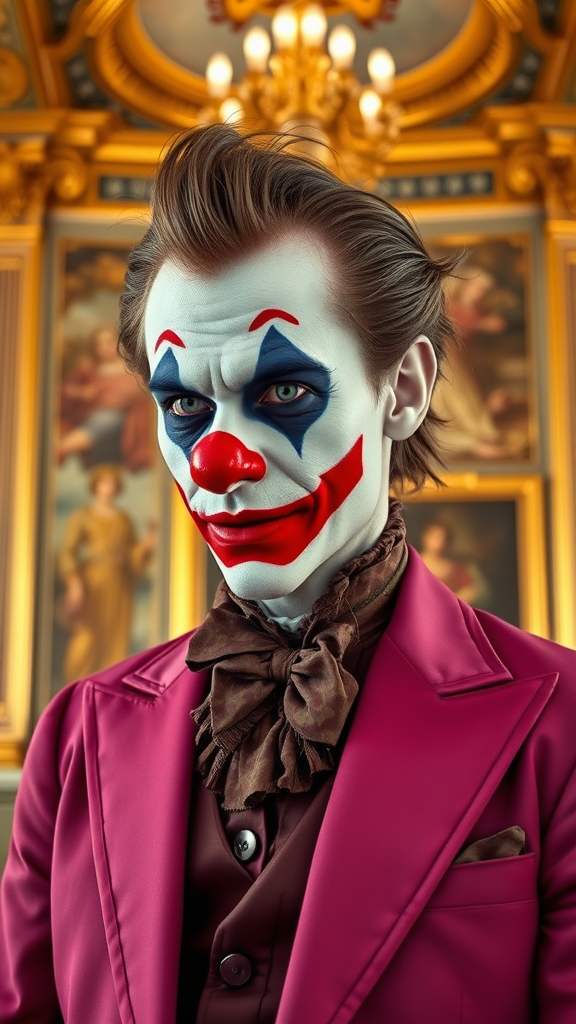 A preternaturally pale and refined Joker, resplendent in 19th century Renaissance-inspired attire and accessorized with carefully crafted, extravagant clown face paint, dominates the cover of an illustrious, avant-garde fashion magazine. Set against a resplendent, sumptuous backdrop of gilded moldings, Baroque frescoes, and polished, lustrous marble, the subject's clown visage is elevated to an unparalleled, sculptural level of elegance via painstakingly intricate, hand-painted details, which reimagines the iconic bright red nose as a shimmering, faceted ruby, glowing with a fiery, inner light. Conducted under a caress of soft, warm luminescence, which subtly enhances the subject's radiant, porcelain-like complexion, the 8K resolution photography renders the resulting image simultaneously nostalgic, evocative of the golden age of artistry and craft, and strikingly, hyper-modern, inviting the viewer to navigate the enigmatic, symbiotic relationship between refined sophistication and rough, unbridled humor.