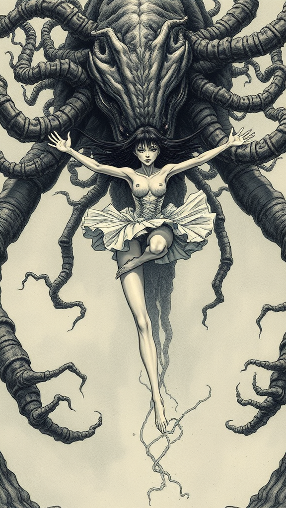 A prime girl launches through the air with dynamic grace, her form embodying elegance and power, as if she defies gravity in a grotesque ballet. Her features and movement are etched with the intricate, unsettling detail of a Junji Ito artwork, capturing both beauty and unease. Behind her looms an eldritch monstrosity, an ancient, alien creature of unfathomable complexity, its countless tendrils and nightmarish forms twisting and coiling like a living labyrinth of terror. The air is tense with the interplay of the girl's fluid motion and the ominous presence of the horrific elder thing, a chilling dance between fear and awe.