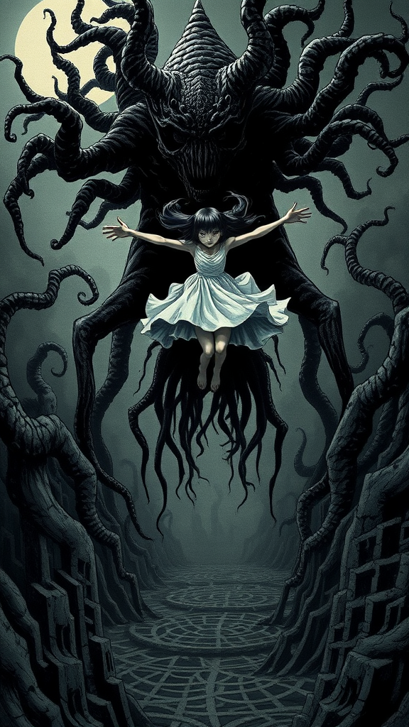 A prime girl leaps gracefully through the air, her figure elongated and surreal, rendered in the unsettling and intricate art style of Junji Ito. Behind her looms a nightmarish eldritch entity, its grotesque and incomprehensible form twisting and churning in the dim, oppressive atmosphere. Dark tendrils reach out like curious fingers, contrasting with the sharp shadows that highlight the girl's ethereal presence. The surrounding landscape is a chaotic blend of distorted geometry and eerie, labyrinthine patterns, merging the boundaries of reality and the unimaginable.