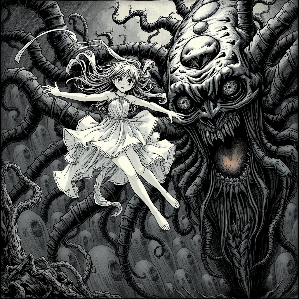 A prime girl with ethereal grace leaps through the air, her form fluid and dynamic, illustrated in a chilling Junji Ito artstyle. Her expression is a mix of determination and awe as she encounters a nightmarish elder being. The backdrop reveals a grotesque entity, with countless writhing appendages and abyssal eyes, emanating an aura of ancient horror. Intricate shadows play across her features, highlighting the surreal nature of this eerie encounter.