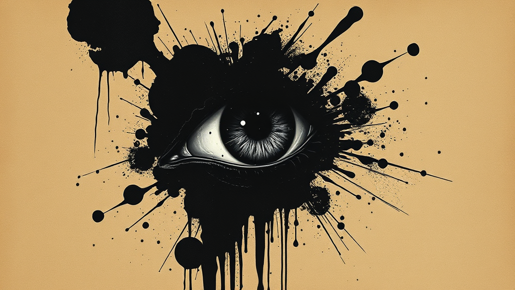 A print of a mysterious eye surrounded by splashes of paint and smudges on textured brown paper, depicted in the style of noir comic art with a gothic black and white palette. The artwork embodies elements of angura kei, merging the haunting essence of monumental ink paintings with the dramatic contrasts of chiaroscuro portraitures. Its biomorphic forms evoke an organic fluidity, while the strokes hint at the depth of an oil painter's touch, all within an elongated vertical composition that accentuates the enigmatic allure.