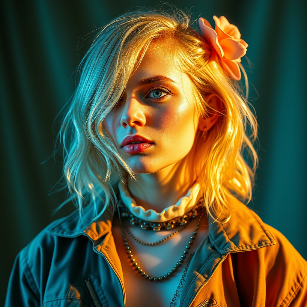A prismatic portrait of a blonde woman adorned in a variety of clothing styles, blending dark aquamarine and soft amber hues. The image merges different artistic influences, featuring a mashup of Whitcomb-girls aesthetics and celebrity iconography. Bathed in a golden light, the portrait is rendered in ultra-high 8k resolution, showcasing an array of styles with a raw and vivid quality.