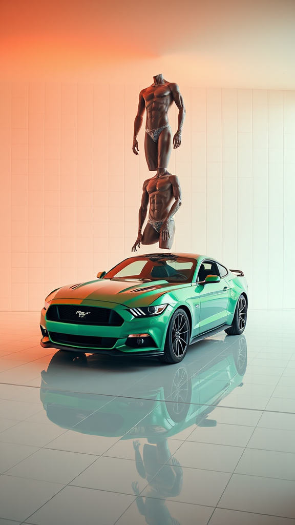 A pristine all-white tile room houses a metallic green Ford Mustang, bathed in perfect orange and bright lighting. The setting is adorned with pastel hues, showcasing an insanely detailed and ultra-realistic depiction suitable for commercial photography. The scene exudes professional color grading, where stacked torsos form a surreal totem pole with distorted anatomy, including extra, missing, and floating limbs. This creates a tableau of mutations and disconnections that evoke an unsettling yet fascinating visual, characterized by ugly, blurry elements reminiscent of bad anatomy and amputation. The photograph captures a unique interplay of beauty and grotesque, set against the backdrop of a sterile, tiled environment.