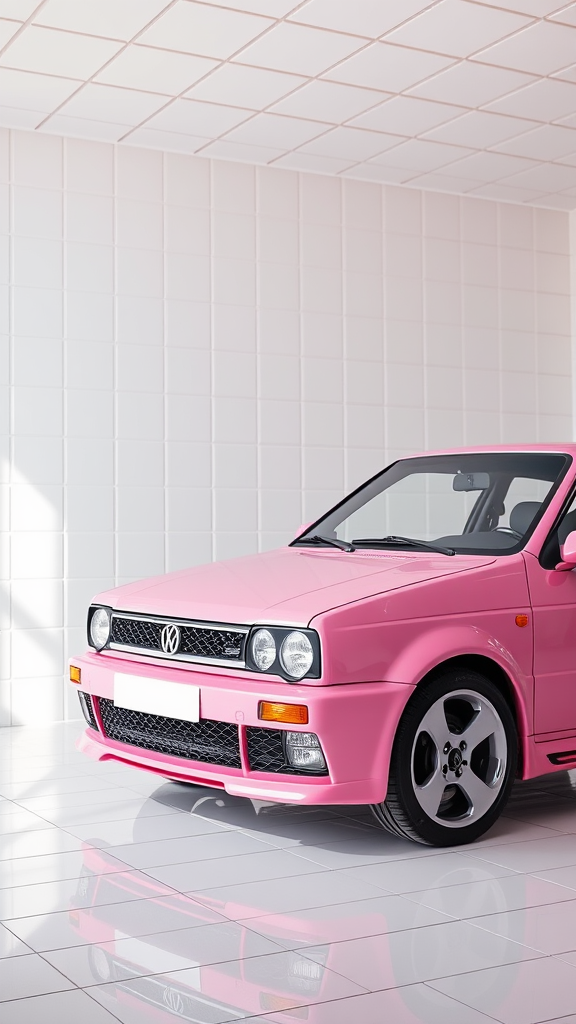 A pristine all-white tile room houses a perfectly pink Volkswagen Golf Mk2 GTI, bathed in bright lighting that highlights pastel hues. The scene is peppered with insanely detailed and fine textures, captured in 8k ultra-realistic quality. The setup exudes commercial photography essence with professional color grading, where the car's glossy sheen and the room's immaculate surfaces complement each other. A subtle play of shadows and reflections adds depth, enhancing the vibrancy of the pink against the crisp white surroundings, while soft pastel accents subtly enrich the composition's visual appeal, adhering to a 4:5 aspect ratio.