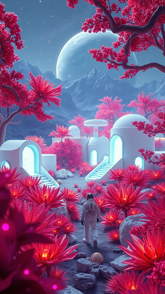 A pristine human settlement emerges on an uncharted planet, where sleek white structures harmonize with radiant vegetation in vivid, striking hues. The flora emits a gentle bioluminescent glow, casting ethereal light across the landscape. A cosmonaut traverses this hyperrealistic environment, marked by exquisite details and intricate crystalline textures, all illuminated by a unique global light. Within this lush tapestry, the scene captures an almost otherworldly beauty, where every element is rendered with precision. Despite the scene's alien allure, strange distortions occur—anatomically incorrect forms, unusual proportions, and surreal mutations—hinting at digital imperfections, like corrupted images or low-resolution signatures. These anomalies give the environment an otherworldly, dreamlike quality, both fascinating and slightly unsettling.