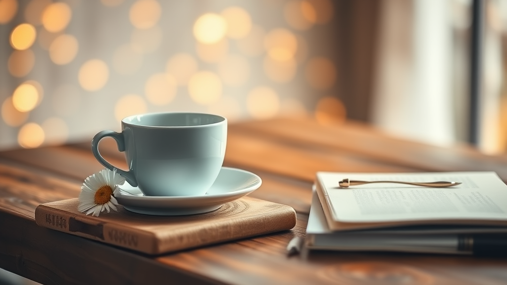 A pristine porcelain coffee cup rests on a rustic oak table, surrounded by a backdrop of shimmering bokeh lights; beside it lies an elegant cream-colored journal and a single daisy. The scene is bathed in warm, inviting light, with meticulous attention to every intricate detail captured in sharp focus. The composition boasts artistic flair and high realism, utilizing a wide f/1.8 aperture for a dreamy depth of field.