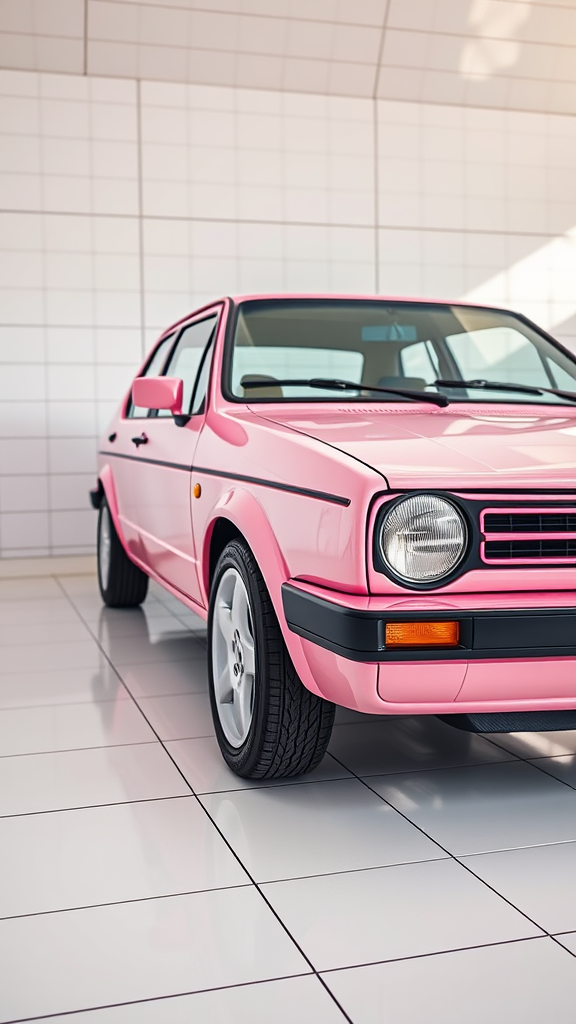 A pristine white tile room showcases a pastel pink Volkswagen Golf Mk2 GTI, exuding retro charm amidst fine, ultra-realistic detailing. The perfect hue of pink car glows under bright lighting, accentuating the artisanal craftsmanship with professional color grading. This commercial photography captures every nuance in 8k resolution, blending timeless nostalgia with modern flair, framed within an elegant 4:5 aspect ratio.