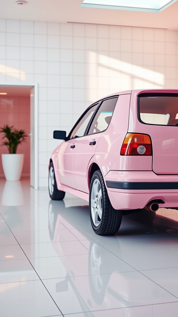 A pristine white-tiled room featuring a striking pastel pink Volkswagen Golf Mk2 GTI, showcasing a perfect pink hue under bright lighting. The scene is rich in fine details and features an ultra-realistic portrayal reminiscent of high-end commercial photography. The professional color grading enhances the vibrant pastel colors, creating an 8k resolution image with a balanced 4:5 aspect ratio. The glossy sheen of the car contrasts beautifully with the clean lines of the room, adding depth and dimension, while subtle reflections on the tiles create a sense of continuity and flow, evoking a sense of elegance and sophistication.