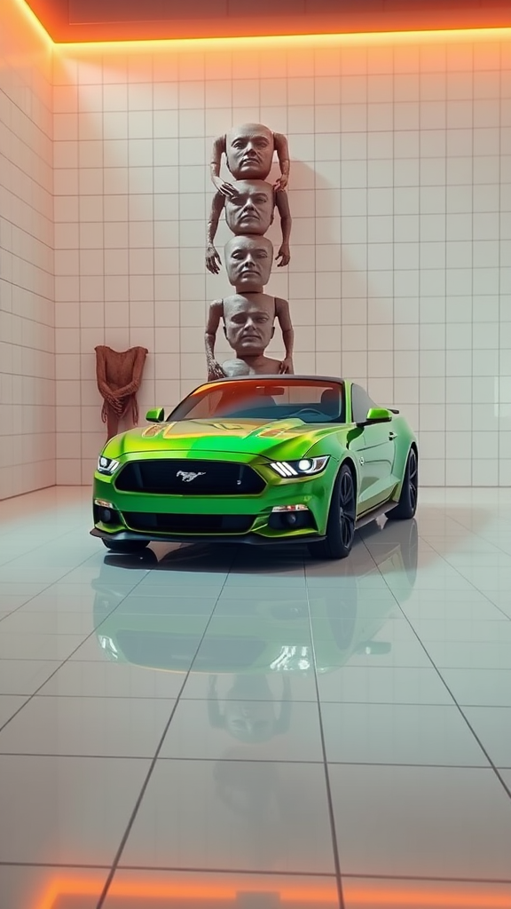 A pristine white-tiled room hosts a metallic green Ford Mustang, bathed in perfect orange and bright lighting. The scene incorporates pastel colors with insanely detailed, ultra-realistic 8k commercial photography, showcasing professional color grading. The setting features a unique totem pole of stacked torsos exhibiting distorted anatomy, with limbs that appear disjointed, extra, or missing, creating a surreal, mutated aesthetic. Elements blur together, giving a sense of strange beauty amid the grotesque, where the familiar meets the bizarre.