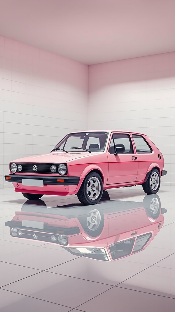 A pristine white-tiled room housing a pink Volkswagen Golf Mk2 GTI with an immaculate shade of pastel pink, illuminated under vibrant, bright lighting. The scene is captured with such extraordinary detail and realism, akin to an 8K resolution image typical of high-end commercial photography. The professional color grading enhances the softness of pastel tones, while the room's reflections create an intricate play of light across the vehicle's surface. This harmonious blend of aesthetics and craftsmanship results in a captivating, vivid visual spectacle.