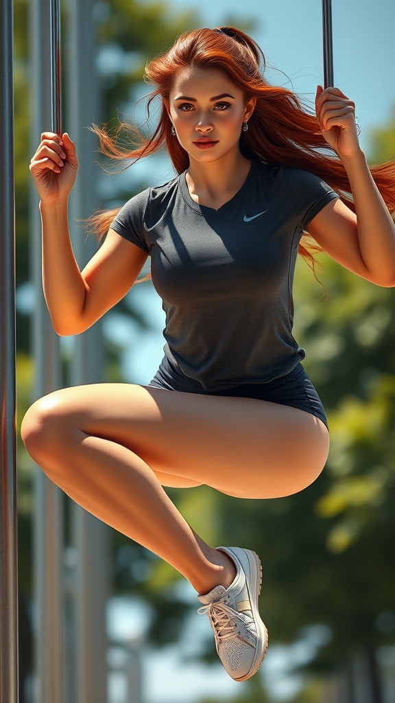 A professional athlete woman, fit and beautiful, with natural curves and dark red hair, fully clothed in an athletic t-shirt on a warm sunny day. She has flushed cheeks, captured in motion while suspended in the air, gracefully holding onto poles. This 3D digital art portrays her in a perfect pose, with flawless anatomy, symmetry, and proportions, making for an amazing 8k wallpaper. The image focuses on her perfect hands, body, feet, face, and expression. The composition is balanced and centered, with no visual distractions or imperfections, maintaining clarity and definition throughout, free of watermarks, logos, or low-quality elements.
