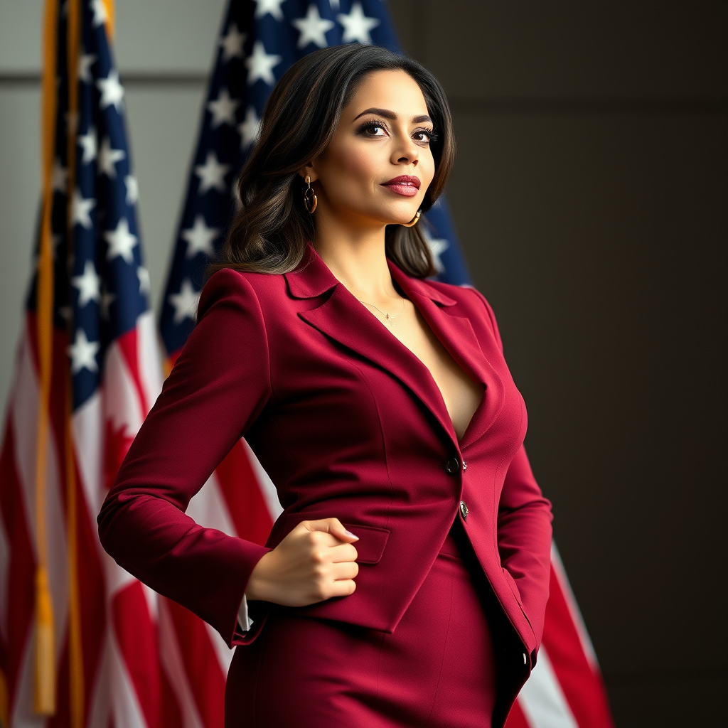 A professional businesswoman confidently standing before the American flag, exuding empowerment and leadership, with a focus on elegance and sophistication.