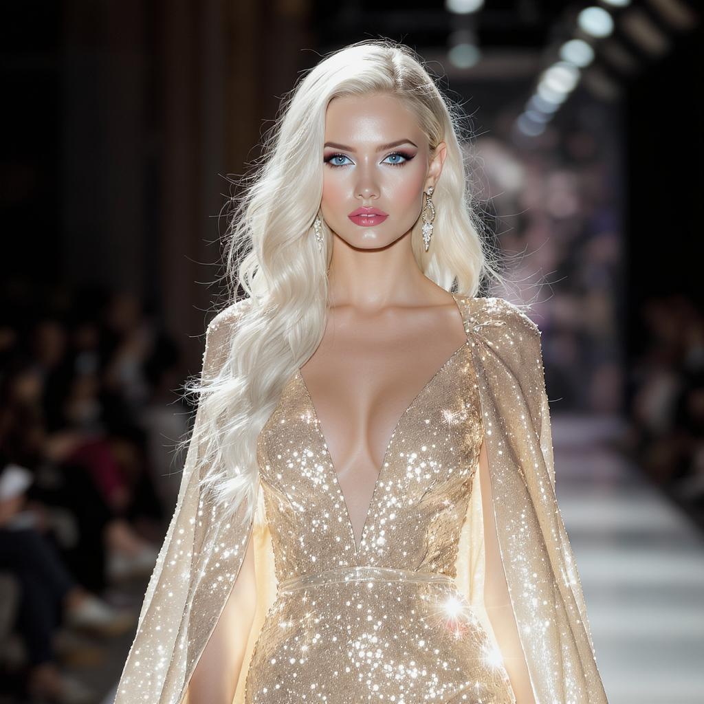 A professional, high-fashion photograph of an ethereal female model in her early 20s with platinum blonde waves and mesmerizing blue-silver eyes. She is adorned in a shimmering champagne gold sequin gown with a dramatic cape. The image is awash with soft pastel hues, contrasted by striking hard light and an ethereal lens flare, set against a subtly lit runway backdrop. The style is bold, vibrantly luxurious, and avant-garde. The image captures a sense of grandeur with heroic elements, evoking a Photo Of The Year quality with a gentle contrast and subtle saturation.