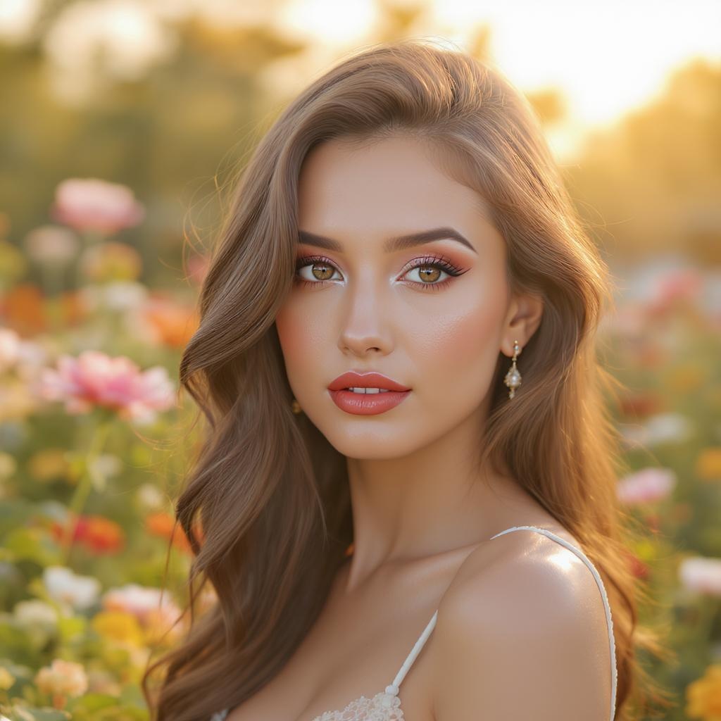 A professional high-resolution photograph capturing a person posing in a vibrant flower garden during the morning, with a sharp focus on their detailed and beautiful face. The image features a dreamy bokeh effect in the blurry background that highlights the subject's clear and striking eyes, complemented by detailed eye pupils. The warmth of lip gloss and a subtle blush on the cheeks enhance the subject's natural beauty, while small, elegant earrings add a touch of sophistication. The soft morning light casts a gentle glow on the scene, creating a picturesque and serene atmosphere. The subject's skin appears radiant and detailed, embodying a sense of high-quality and refined artistry.