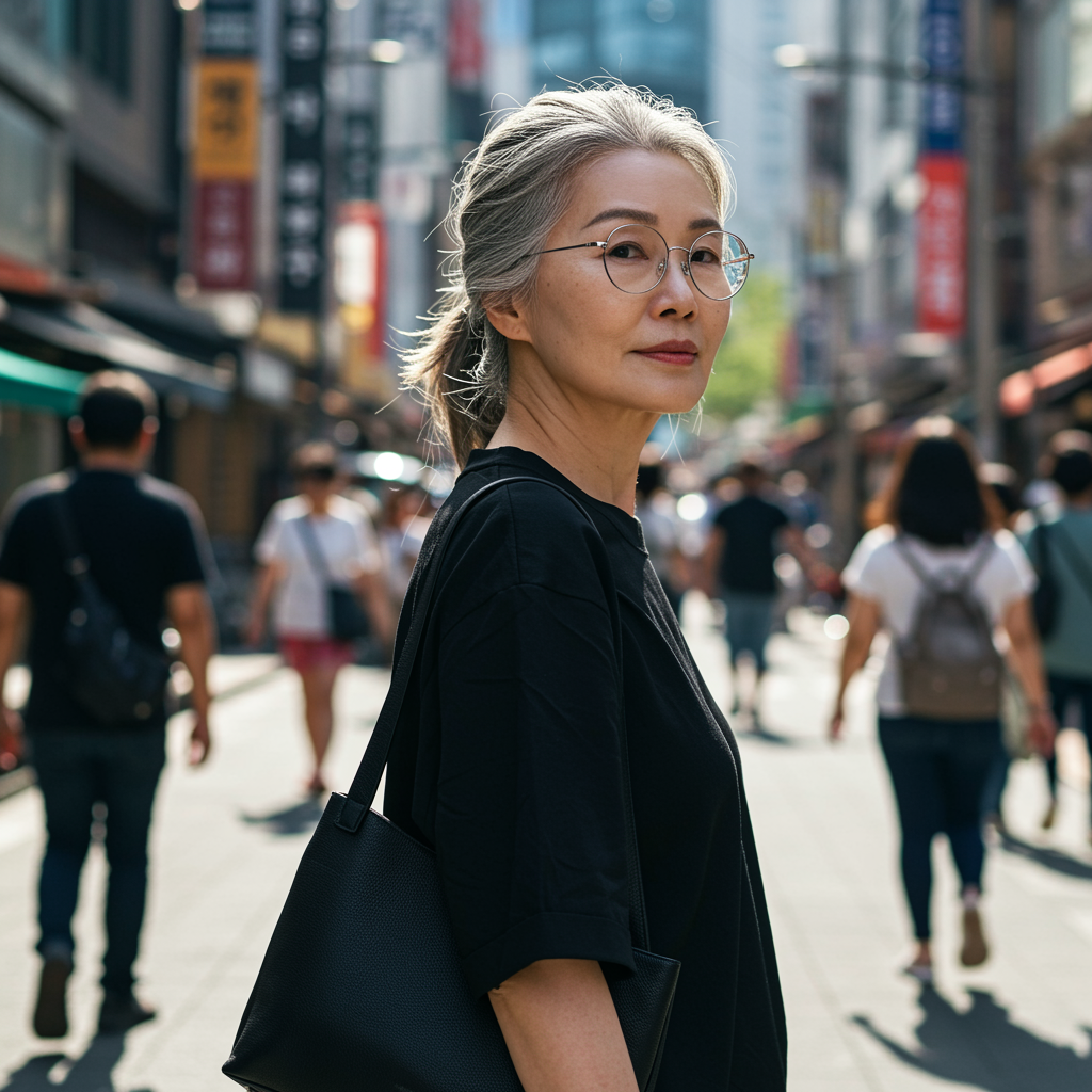 A professional Korean woman model, embodying an aura of wisdom and experience, stands poised in a side view, upper-body shot against the backdrop of a bustling Seoul street. The crowd swirls around her, yet her gaze is calm and self-assured. Clad in a monochromatic black loose-fit T-shirt paired with a sleek black shoulder bag, her look is refined and understated. Her hair is styled in a neat ponytail, accentuated by silver frame glasses that add to her intellectual charm. Her bold pose exudes confidence, a portrait of aged grace and contemporary urban fashion. The urban setting is brought to life with realistic sunlight and shadows, capturing the essence of modern urbanism in a photorealistic style, UHD quality.