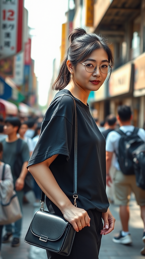 A professional Korean woman model, side view and upper-body, stands gracefully against a bustling street in Seoul, surrounded by a vibrant crowd. Her gaze, strong and wise, conveys a sense of experience. She’s dressed in a minimalist black loose-fit T-shirt and carries a sleek black crossbody bag. Her hair is neatly tied in an elegant ponytail, and she wears chic silver-framed glasses. Her pose is confident yet gentle, embodying aged grace with a touch of urban fashion. The scene captures the essence of urbanism with realistic sunlight and shadows enhancing the photorealistic qualities, presenting a captivating portrait in UHD – an ode to the city’s dynamic rhythm and enduring elegance.