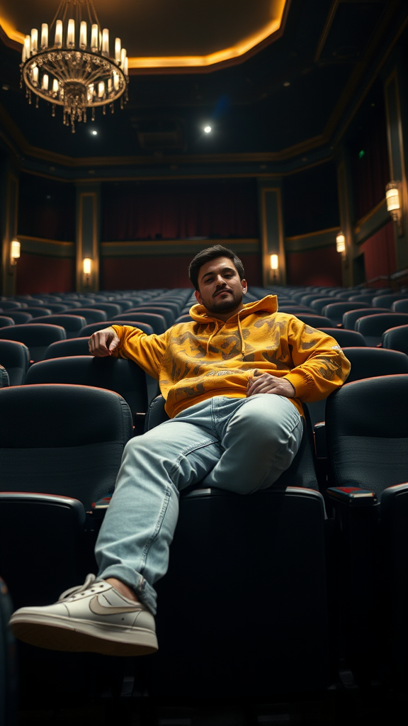 A professional male model is lounging across the seats in a dimly lit movie theater, capturing a moment of carefree relaxation. He is wearing an oversized yellow camouflage-pattern hoodie and light-washed jeans. The scene presents a full architectural perspective of the theater, enhanced by a soft glow from elegant ceiling lights that creates a serene ambiance. The photograph is taken from a long-distance front view, focusing on photorealism with high contrast and luminous highlights, in stunning UHD, showcasing the tranquil mood and design intricacies of the setting.