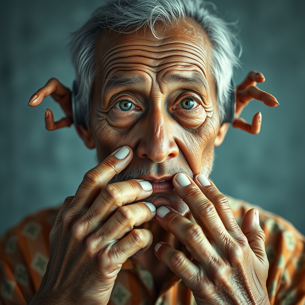 A professional medium-shot portrait of a seasoned 50-year-old fisherman with robotic eyes, captured using a Nikon Z9 at f/1.8, 100mm. The image depicts intentional quirks such as unusual anatomy with a surreal touch, including extra limbs and digits. The visual composition leans towards abstraction, with elements like out-of-frame segments, tiled patterns, and distorted features creating an artistic, otherworldly feel. The fisherman's hands and feet are depicted with an artistic imperfection, and the overall scene carries a subtle 3D character, with a desaturated color palette enhancing the dreamlike quality.