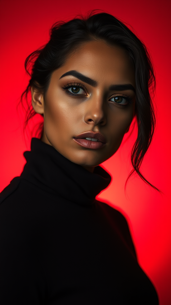 A professional model with striking Greek dark facial features is captured in a front-facing, upper-body shot. The model's eyes are mesmerizing, with one blue and the other brown, embodying an intriguing duality. Photographed using a Hasselblad X2D 100C and a XCD 90mm f/2.5 lens, the scene is infused with cinematic red color grading enveloped in golden hour warmth. The backdrop showcases a dramatic gradient shifting from burnt umber to ruby red, enhancing the deep black silhouette of the model elegantly posed with a tilted head. The profound gaze meets the camera with an elongated stance, a flowing black turtleneck adding motion. The lighting is masterfully executed, with a professional Fresnel light at a 60-degree angle with silk diffusion, complemented by a rim light with CTO gel at a 75-degree angle. Haze introduces an ethereal atmosphere, while feathered shadows and contrast curve manipulation add depth. The image benefits from selective dodge and burn techniques, grain texture overlay, and a color temperature gradient from 5500K to 3200K, ensuring ultra-sharp details. Inspired by Paolo Roversi's lighting technique, the photograph is hyper-realistic, presented in 16K resolution, exuding rich detail and personalized artistry.
