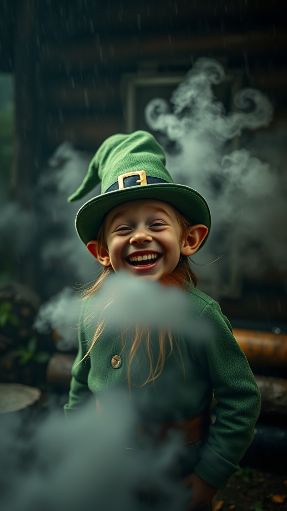 A professional photo of a joyful leprechaun wearing a cap, set in a misty, rainy, stormy landscape. Captured with a 70mm lens, the scene is cinematic and highly detailed, with intricate textures in the wooden surroundings. The cinematic lighting casts dramatic shadows, enhancing the sharp focus of this medium shot. Voluminous fog drifts through the scene, creating a mystical atmosphere. Shot in HDR 8k, the image is remarkably realistic and vibrant, with subtle creative nuances bringing depth and character to the leprechaun and its environment.