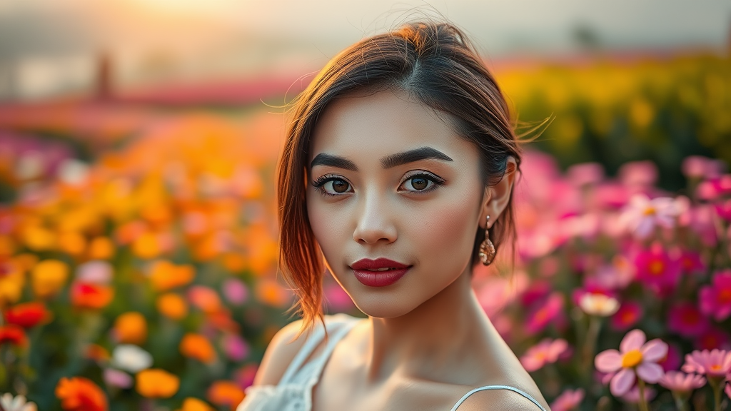 A professional photograph featuring sharp focus and stunning 8K resolution captures a person posing gracefully in a vibrant flower garden during the early morning hours. The soft light and HDR quality highlight the exquisite details of the scene. The background features a beautifully bokeh-blurred landscape, enhancing the subject's presence. The subject has radiant, high-detailed skin, with a perfectly detailed face, clear and beautiful eyes that show every intricate detail of the pupils, and is subtly enhanced with lip gloss and a gentle blush on the cheeks. Delicate small earrings add a touch of elegance. The scene is filled with the freshness of morning dew and the serene beauty of nature, providing an ideal backdrop for this photoshoot. Avoiding elements of sketches or paintings, the focus remains on capturing the natural, high-res beauty of the subject and surroundings.