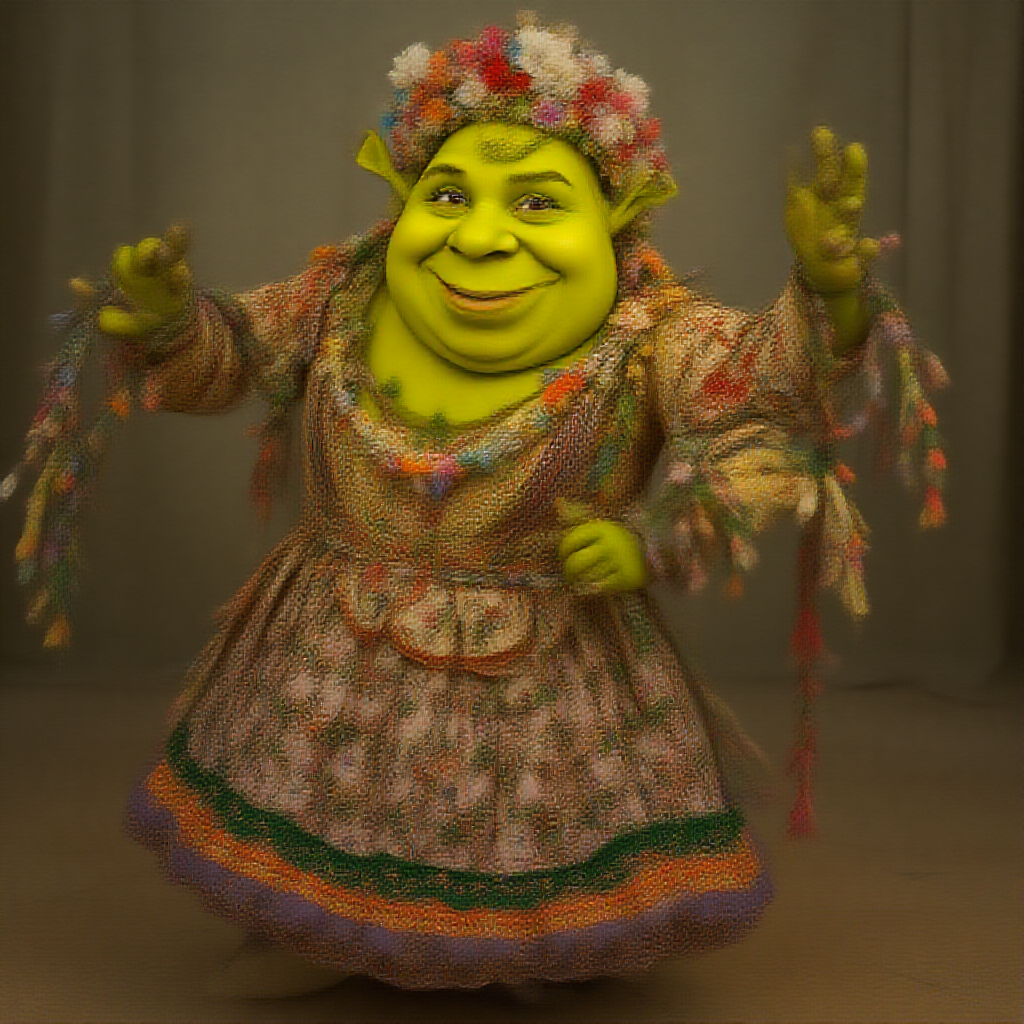 A professional photograph of Shrek adorned in elaborately decorated floral ornaments and a long folk dress, exuding fun and joy while dancing. The image is highly detailed, photorealistic, with intricate features enhanced by ambient sun lighting, captured in 8k UHD. Despite these qualities, elements such as text, framing errors, and various distortions like poor quality, jpeg artifacts, duplication, and unnatural features—such as extra limbs, poorly drawn face and hands, mutations, and disproportionate anatomy—are present, alongside blurred areas, deformed figures, and imperfections like watermarks and signatures.