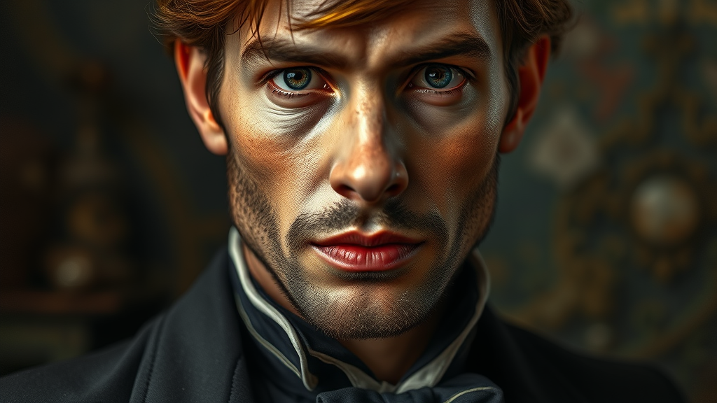 A professional portrait avatar of a person styled in the XIX century, featuring bold and heavy brushstrokes with textured impasto paint, capturing a highly detailed and intricate design. The scene is illuminated with cinematic lighting akin to masterpieces by Vittorio Matteo Corcos, Albert Lynch, and Tom Roberts, presenting a dramatic flair. The subject's skin is rendered with highly textured detail, exuding a rich and realistic quality. The overall composition embraces an 8k resolution, reflecting a visual narrative that is seamlessly professional yet creatively modified for uniqueness, embodying an essence that would garner attention on platforms like ArtStation.