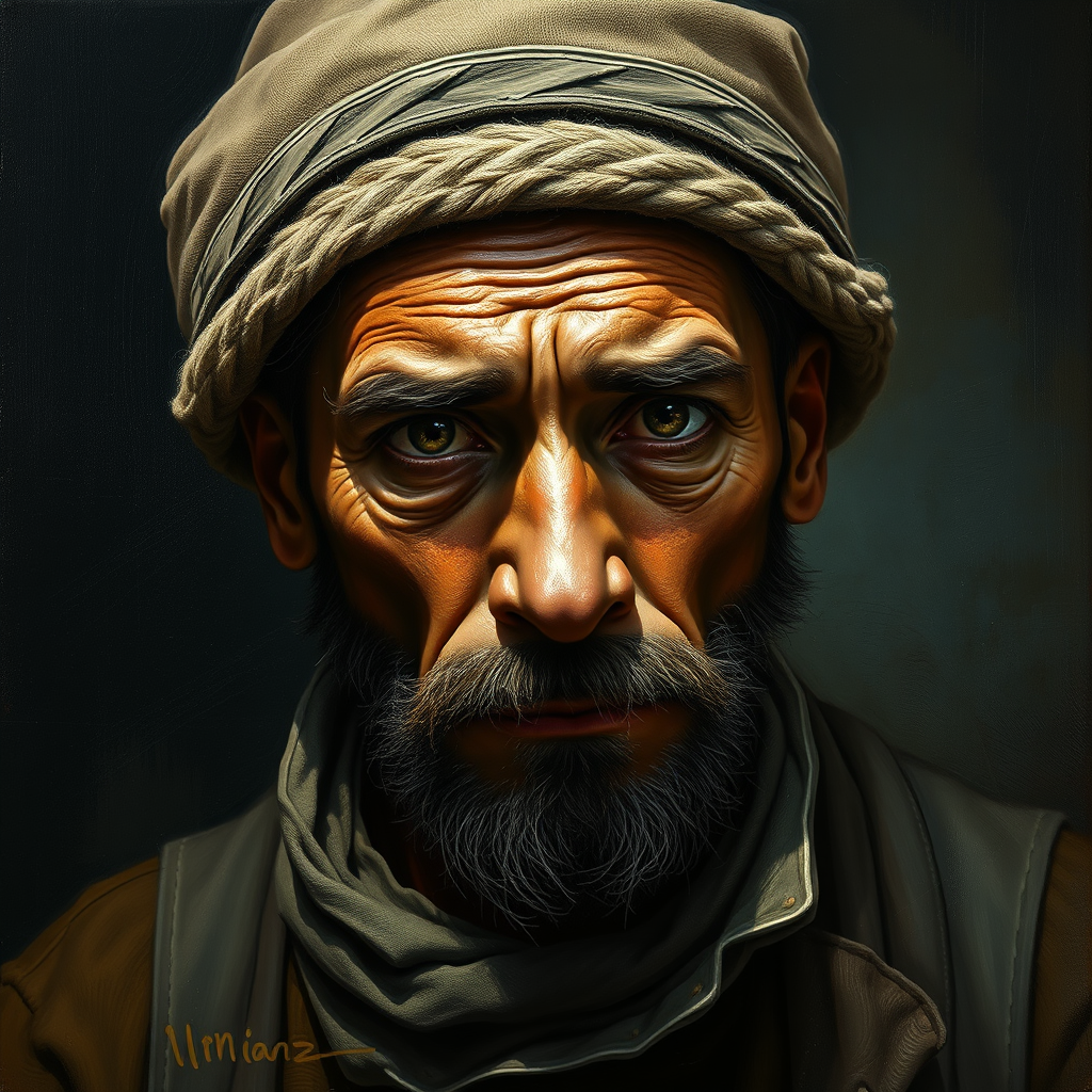 A professional portrait of a 19th-century male worker with a weary expression, capturing the essence of the 1800s. Employ heavy brushstrokes and textured, impasto paint for a rich, detailed composition. The scene is illuminated with cinematic lighting, highlighting highly textured skin and creating a dramatic atmosphere. Rendered in oil, the painting exhibits intricate details with a style reminiscent of Vittorio Matteo Corcos, Albert Lynch, and Tom Roberts. The artwork boasts 8k resolution and is a trending piece on ArtStation, with subtle creative enhancements maintaining the original concept.