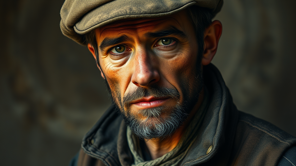 A professional portrait of a 19th-century worker, male, exhibiting a weary expression, characterized by dynamic brushwork and thick, textured impasto paint, meticulously detailed and intricate, with cinematic lighting akin to an oil painting. The portrayal features highly textured skin and dramatic ambiance, evocative of the styles of Vittorio Matteo Corcos, Albert Lynch, and Tom Roberts, rendered in ultra-high definition, trending on ArtStation, capturing the historical essence and artistic mastery of the era with a touch of creative flair.