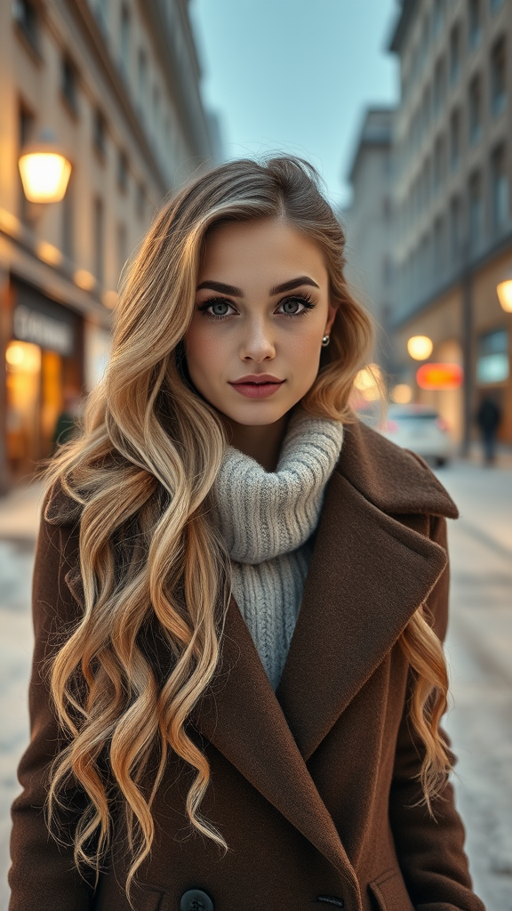 A professional portrait photograph featuring a stunning Norwegian girl dressed in stylish winter attire, showcasing her long, wavy blonde hair and a flirty gaze. Her face, adorned with charming freckles and natural makeup, is beautifully symmetrical. She stands in a snowy city street, surrounded by a modern urban upscale environment. The image is ultra-realistic and conceptually artistic, with an intricate level of detail and sharp focus. Captured with a medium shot at f/1.8 and 85mm, the composition is centered and professionally color graded. The scene is illuminated by bright, softly diffused light and enhanced by a hint of volumetric fog. The photograph trends on Instagram and Tumblr, boasting HDR quality in 4K and 8K resolution.