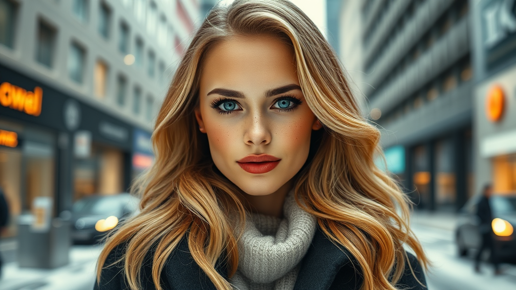 A professional portrait photograph of a stunning Norwegian woman in chic winter attire, featuring long, wavy, sunlit blonde hair framing a face filled with charming freckles and strikingly symmetrical features. Her makeup is subtle and natural, enhancing her innate beauty. She stands gracefully in a vibrant snowy urban street, surrounded by a sleek, modern cityscape. The image captures exquisite realism and artistry, with intricate detail and sharp focus, utilizing an 85mm lens at f/1.8 for a medium shot. The scene is bathed in diffused, bright light with a touch of soft, volumetric fog enveloping the environment. It's a visual masterpiece that trends across Instagram and Tumblr with its HDR 4k resolution, echoing modern elegance and sophistication.