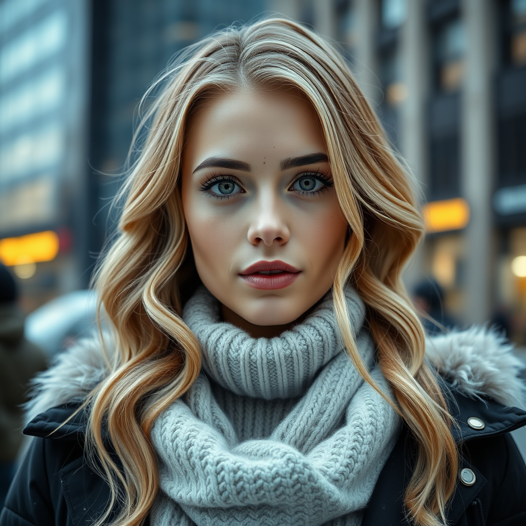 A professional portrait photograph of a woman with a symmetrical face, dressed in winter clothing with long wavy blonde hair and light freckles. She has a natural, cute makeup look against a stunning modern urban upscale backdrop. The image is ultra-realistic with concept art qualities, appearing elegant and highly detailed. It is captured with sharp focus and depth of field using an f/1.8, 85mm lens, taken as a medium, mid shot. The setting includes a hint of volumetric fog, creating a cinematic feel. It has the high-resolution quality sought after on platforms like Instagram and Tumblr, presented in HDR 8k. The photograph exudes a realistic yet artistic vibe, avoiding any flawed composition or additional unnatural elements.