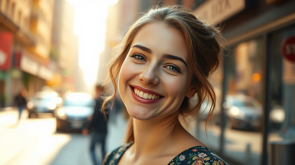 A professional portrait photograph of Anya Taylor-Joy smiling on a vibrant city street, ultra-realistic, concept art style, capturing an elegant and intricate expression with sharp focus and depth of field, shot with an f/1.8 aperture at 85mm, in a medium shot, trending on Instagram and Tumblr, in stunning 4k and 8k resolution, showcasing natural beauty with a touch of sunlight casting a warm glow, maintaining simplicity and grace in composition.